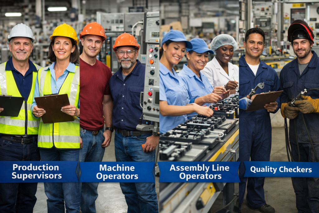 • Quality Checkers – Conduct inspections and testing to maintain product quality and compliance.